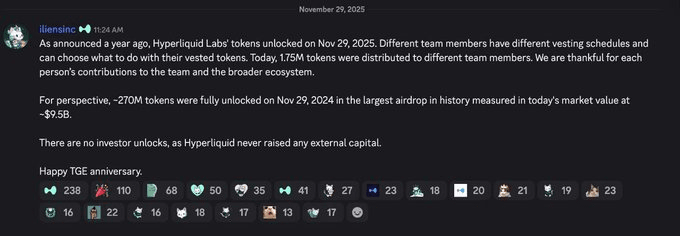 El equipo detrás de Hyperliquid cumplió con su plan de distribución de tokens. Estos tokens fueron para las personas que han estado construyendo y desarrollando la plataforma desde el primer día. No es un movimiento sorprendente; lo anunciaron de antemano, lo que muestra transparencia.