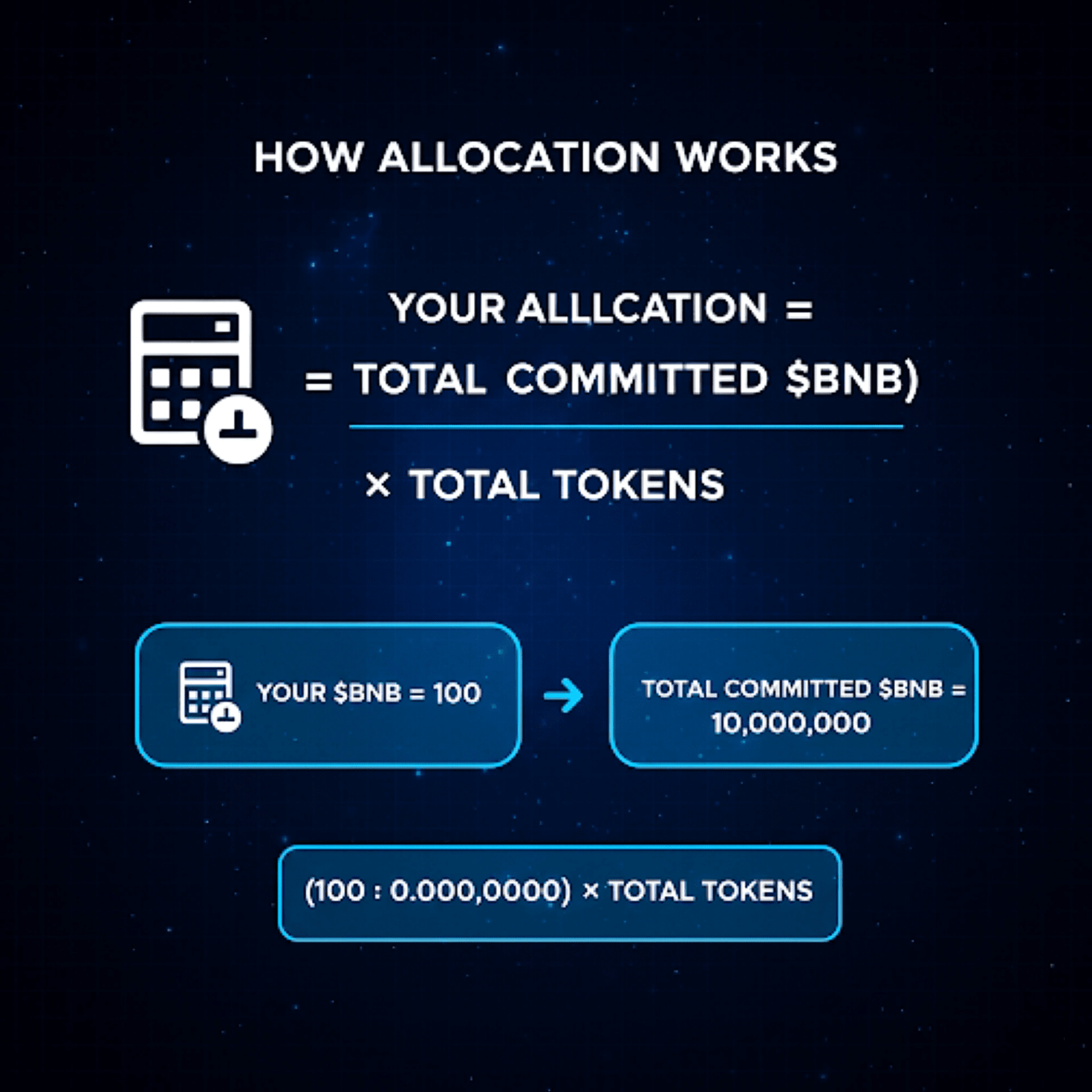✅ Fórmula de Asignación – Su parte = (Su $BNB / Total $BNB Comprometido) × Total de Tokens