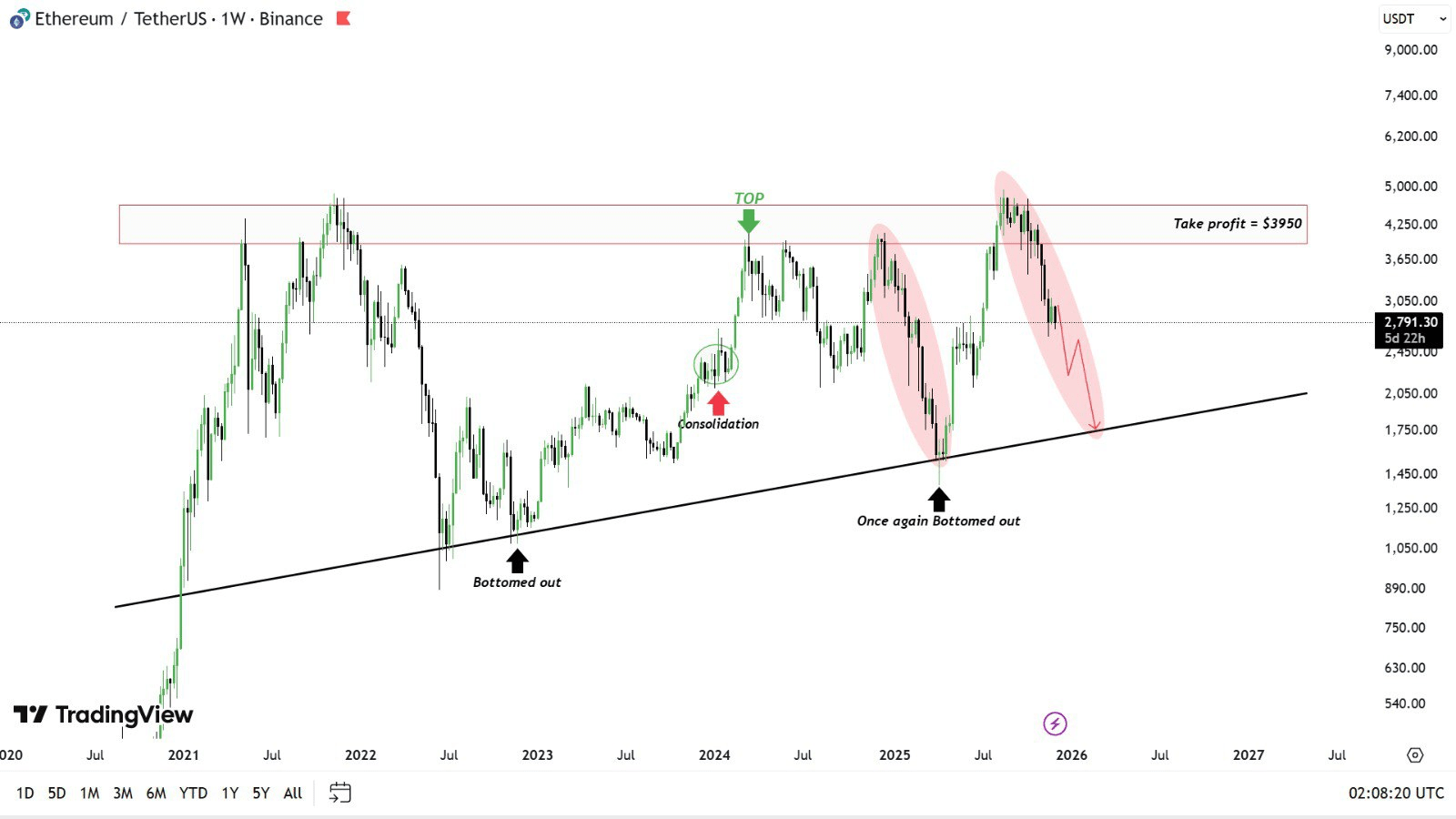 Ahora estoy anticipando que ETH estará en su punto más bajo 📉 una vez más. Ten cuidado ❗️ con ETH