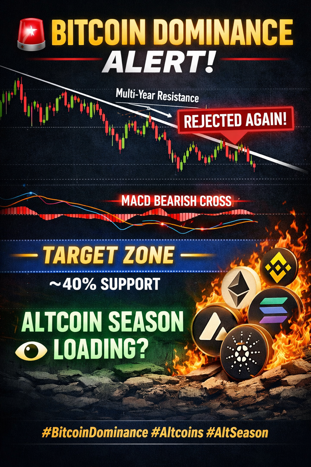 📉 BTC.D acaba de enfrentar otro rechazo en una resistencia de línea de tendencia de varios años — un nivel que históricamente ha limitado el alza.