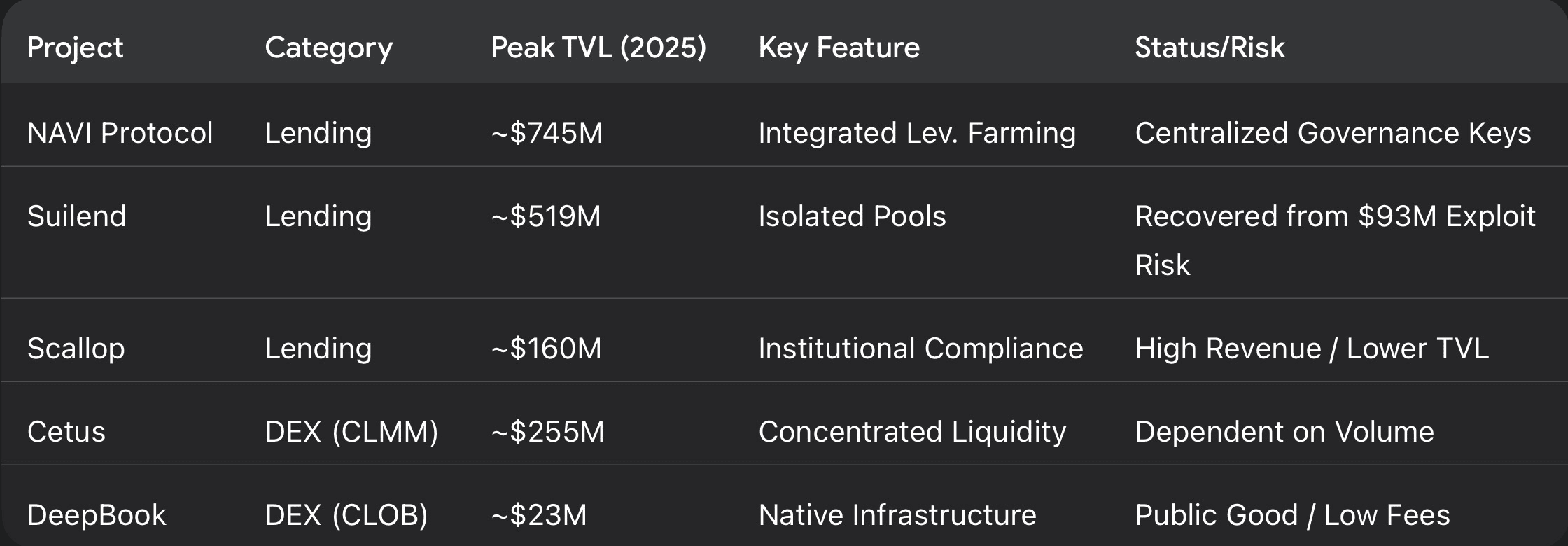 Protocolo NAVI: Consistentemente el protocolo más grande por TVL (alcanzando picos de $745M), NAVI ha capturado con éxito el mercado de "bloques de dinero" en Sui. Integra préstamos con provisión de liquidez, actuando efectivamente como un corredor principal para el ecosistema. Sin embargo, persisten preocupaciones de la comunidad sobre la centralización de sus claves de gobernanza, con las autoridades de "mint/freeze" aún en manos del equipo a finales de 2025.