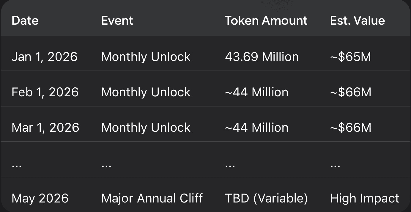 El cronograma de liberación de tokens es un factor crítico para los inversores a corto y medio plazo. El 1 de enero de 2026, la red experimentó un evento de desbloqueo significativo.