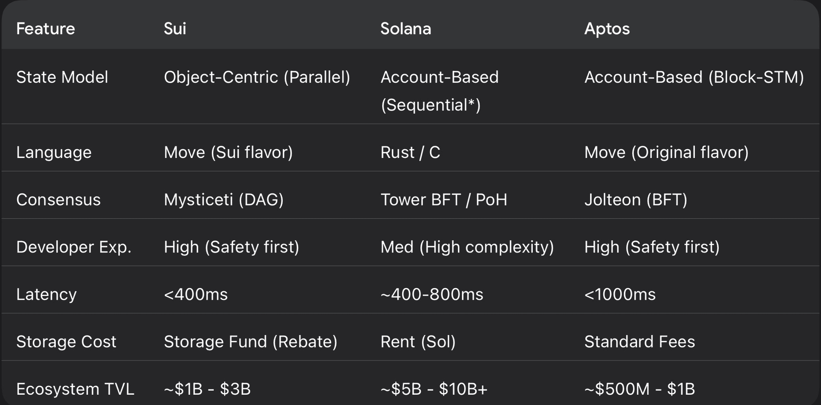 Para valorar con precisión a Sui, uno debe compararlo con sus pares: Solana (el actual líder en Capa 1 de alto rendimiento) y Aptos (su hermano tecnológico).