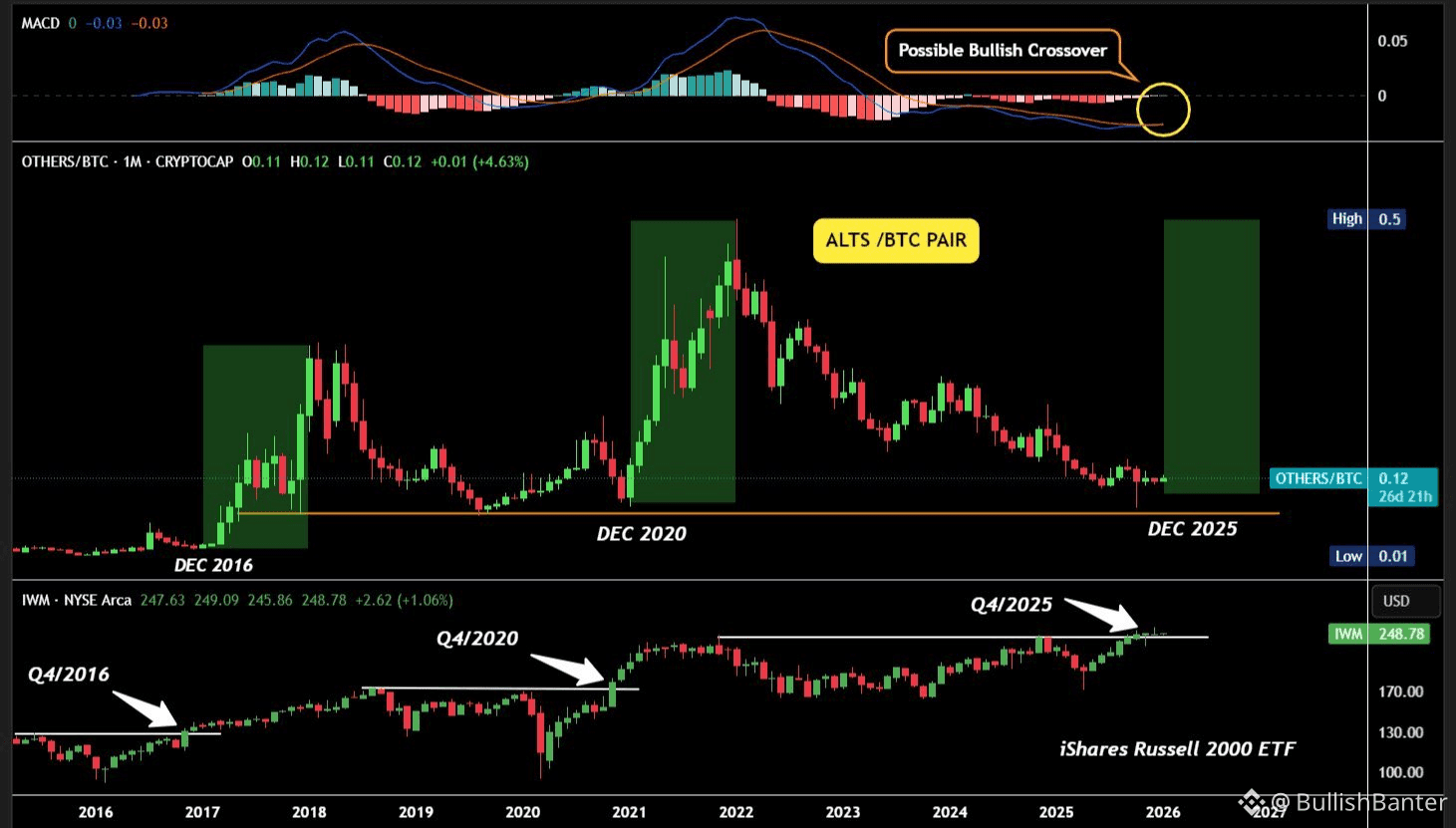 Finales de 2016: Russell 2000 rompió por encima de la resistencia → las altcoins se dispararon en 2017