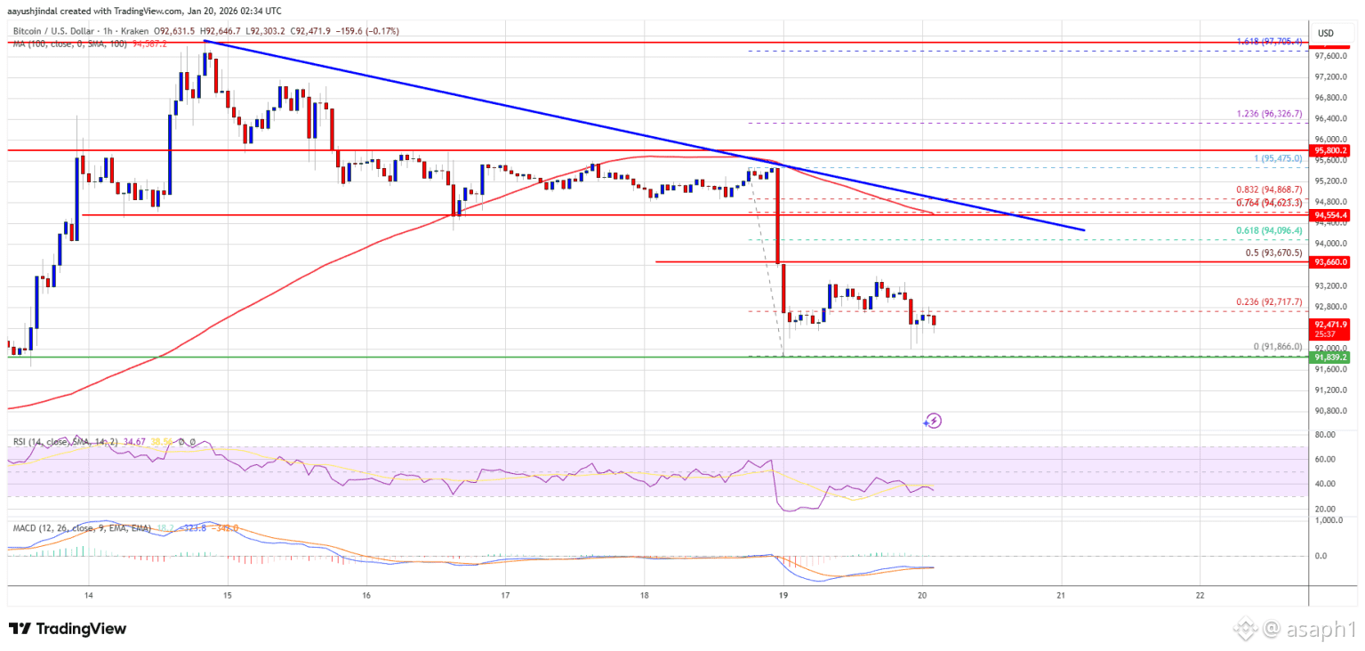 Miren, la cosa está así: nuestra moneda reina no pudo aguantar el ritmo y se nos fue en picada, cayendo incluso por debajo de los $92,000. Ahora mismo, el precio anda intentando respirar, consolidando pérdidas después de tocar un mínimo de $91,866. Para los que siguen las medias móviles, el panorama nos dice que estamos por debajo del promedio de las últimas 100 horas, lo que en lenguaje sencillo significa que la presión de venta está ganando la batalla por ahora. 🥊