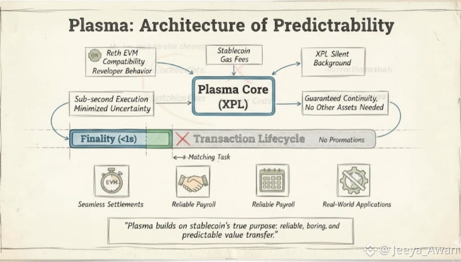 Its architecture embodies this philosophy. Reth's full compatibility with the Ethereum Virtual Machine (EVM) ensures predictability of developer behavior. Sub-second execution times minimize uncertainty. Stablecoin-based gas fees eliminate volatility in the operational process. XPL runs silently in the background, guaranteeing continuity of validators and transactions without requiring end-users to manage other assets for transfers.
