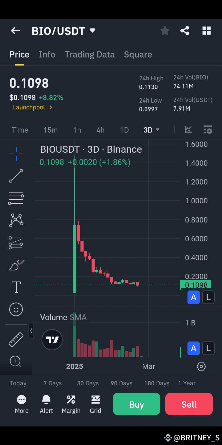 Looking at the chart, we can see that *BIO* has experienced a sharp price drop. The current price is *0.1098*, which is *+8.82%* from the previous day. While itâs showing some green today, weâre still far from the highs it once saw. The price has fluctuated between a *24h high of 0.1130* and a *24h low of0.0997*. It's important to note that *BIO* has been struggling to break out of the downtrend that has lasted for a while.