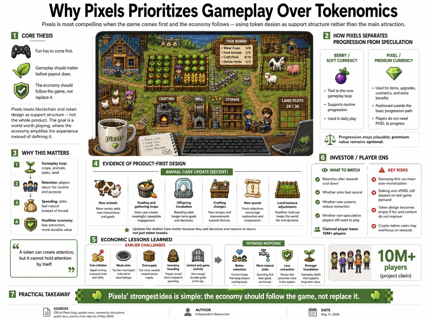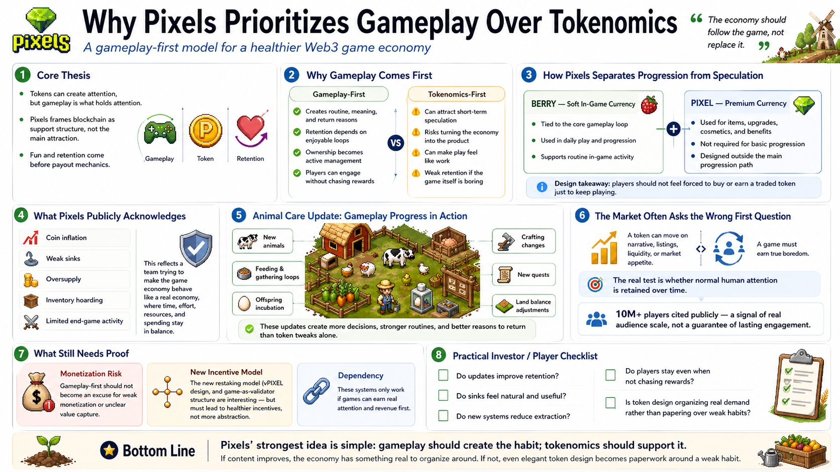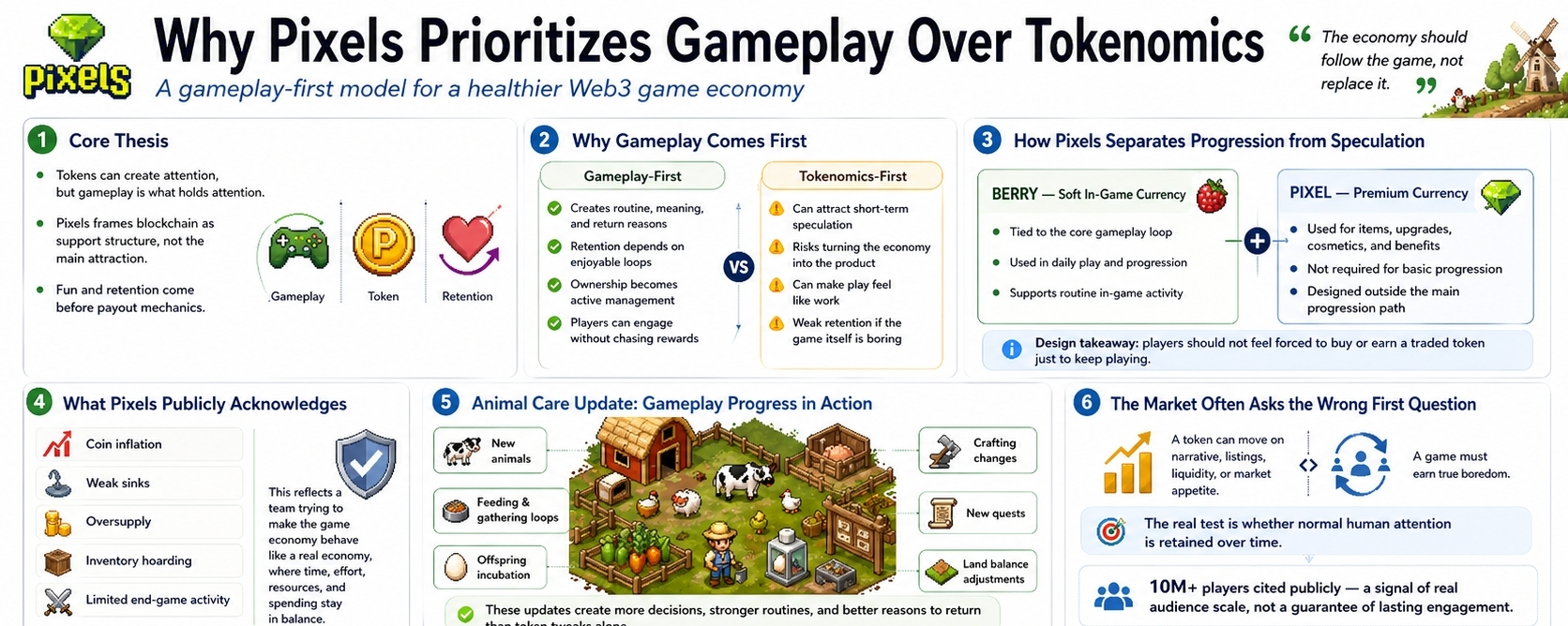 I think Pixels prioritizes gameplay over tokenomics because it has already seen what happens when a game lets the economy become the product. A token can create attention, but I don’t think it can hold attention by itself. Pixels’ own recent framing is unusually direct about this. Its whitepaper says the game needs an intrinsic reason for people to spend time inside it, and that fun has to come first, even while blockchain adds new possibilities. That matters to me because it treats token design as support structure, not as the main attraction.