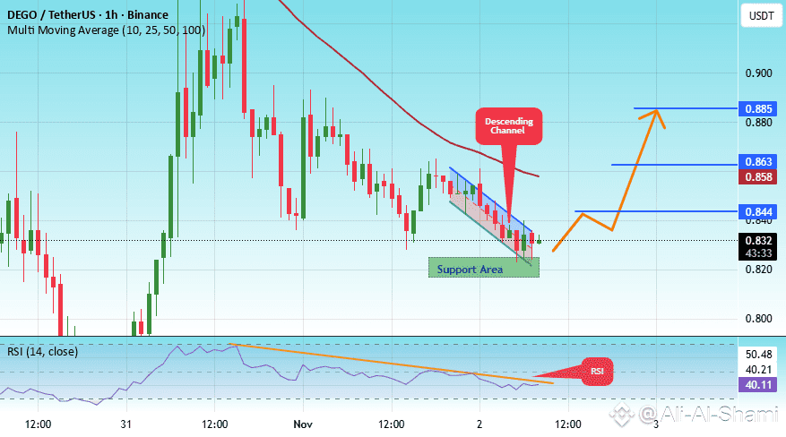 هناك منطقة دعم رئيسية باللون الأخضر عند سعر 0.822، تمثل نقطة دعم قوية.