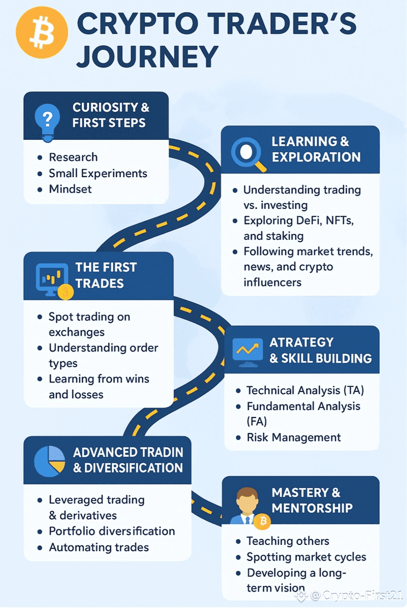 Every crypto journey starts with curiosity. You hear about Bitcoin, Ethereum, or other digital assets and wonder how they work. At first, you research the basics about blockchain, wallets, and exchanges, and you might try a small experiment by buying a fraction of a coin with minimal risk. This stage is about thinking open-mindedly, being cautious, and accepting that mistakes are part of the process.