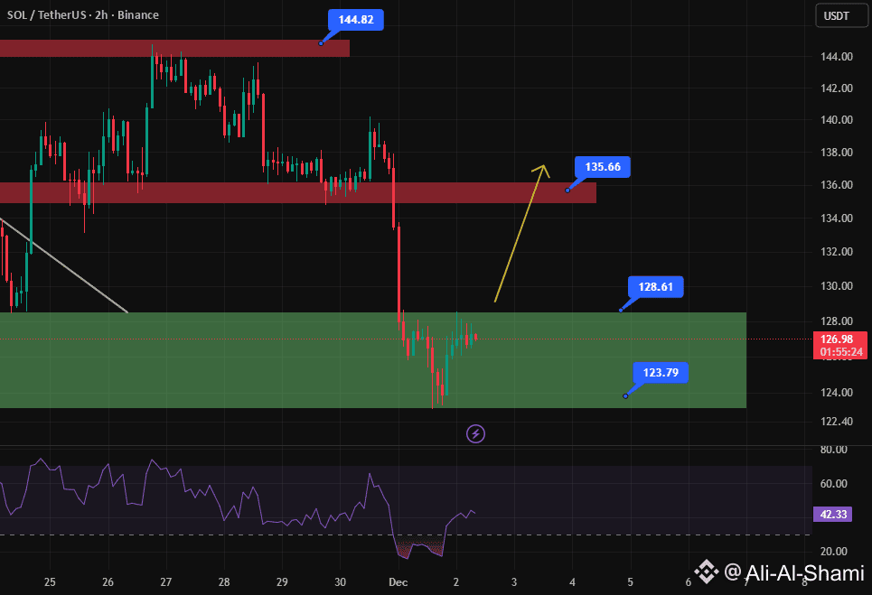 سولانا حالياً بين صندوق دعم ونطاق، مع الأسعار بين 123$ و128$، وهو دعم مهم جداً، ومؤشر القوة النسبية أيضاً في منطقة البيع المفرط 💰💲