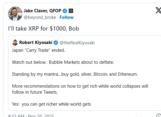 Claver, however, shifted the discussion toward a different digital asset. Responding to Kiyosaki, he said he would gladly take XRP even at a $1,000 valuation. His remark highlighted how some market participants view XRP as a long-term strategic play despite—or because of—current macro uncertainty.