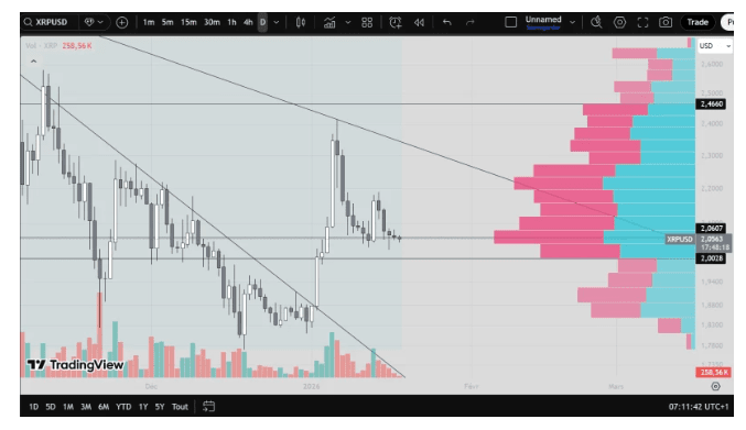 👉 En regardant le graphique, XRP se consolide juste en dessous d'une ligne de tendance descendante qui a plafonné l'action des prix depuis qu'elle a atteint un sommet autour de 2,40 $. En ce moment, elle se situe juste au-dessus d'une zone de volume élevé entre 2,00 $ et 2,06 $, où beaucoup de transactions ont eu lieu récemment. Ce regroupement d'activité montre que le marché essaie de déterminer si cette fourchette de prix représente une bonne valeur ou s'il y a encore de la place pour tomber.