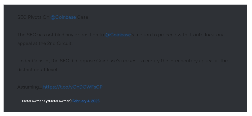 Pengacara pro-XRP James Murphy, yang dikenal sebagai MetaLawMan, menunjukkan perubahan signifikan dalam perilaku SEC. Agensi tersebut baru-baru ini memutuskan untuk tidak menentang mosi Coinbase untuk banding interlokutori, sebuah langkah mengejutkan mengingat sikap keras SEC sebelumnya di bawah Ketua Gary Gensler.
