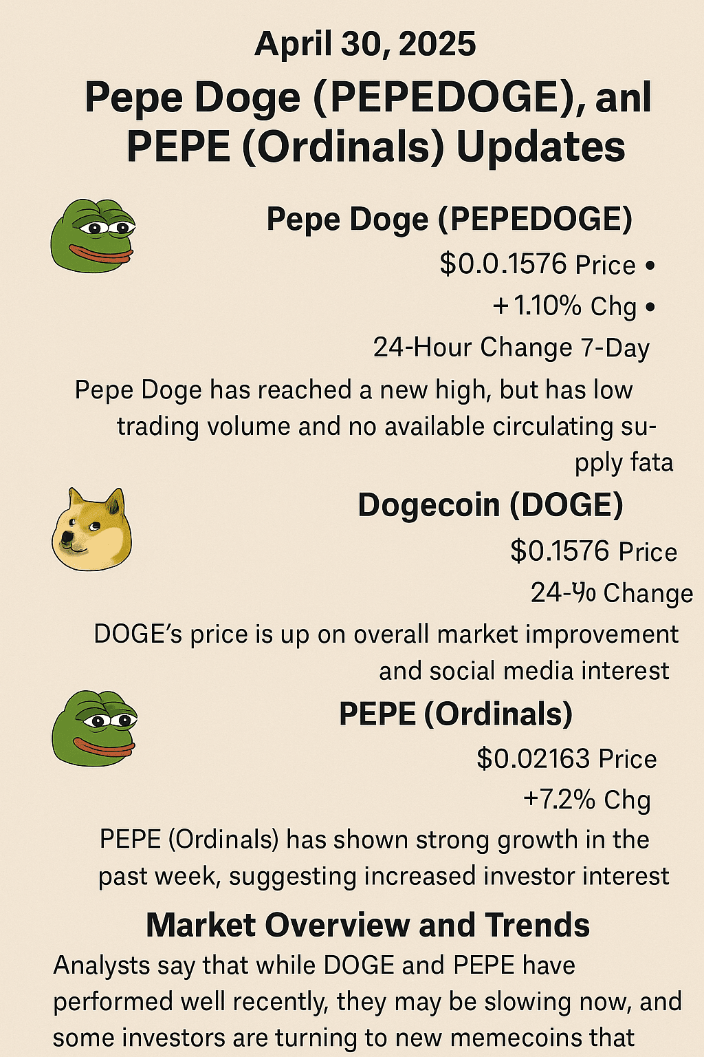 Pepe Doge telah mencapai tinggi sepanjang masa yang baru, mencerminkan minat yang meningkat meskipun volume perdagangan yang rendah dan pasokan yang beredar belum dilaporkan.