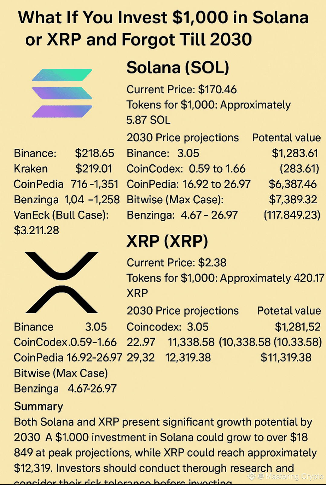 Per 9 Mei 2025, berikut adalah analisis terbaru dari investasi $1,000 di Solana (SOL) dan XRP, berdasarkan harga saat ini dan proyeksi 2030.