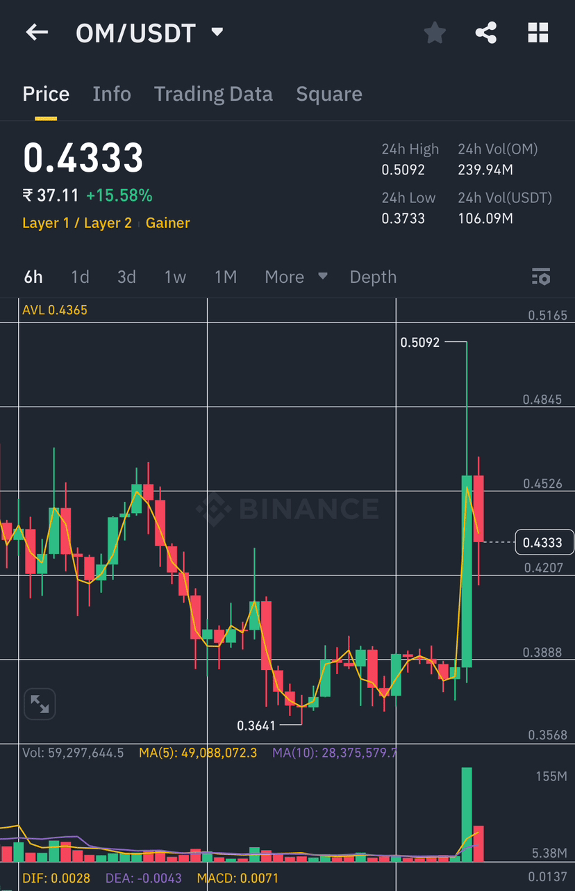 OM Coin melonjak +15.58% dalam 24 jam, mencapai tinggi $0.5092 sebelum koreksi minor ke $0.4333 🔄