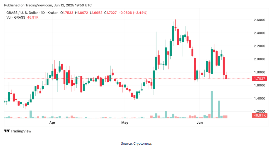 Rumput ($GRASS), token asli dari platform DePIN (Jaringan Infrastruktur Fisik Terdesentralisasi) berbasis Solana terkemuka, telah turun sebesar 15%, jatuh dari puncak $1.96 menjadi sekitar $1.72 pada saat penulisan.