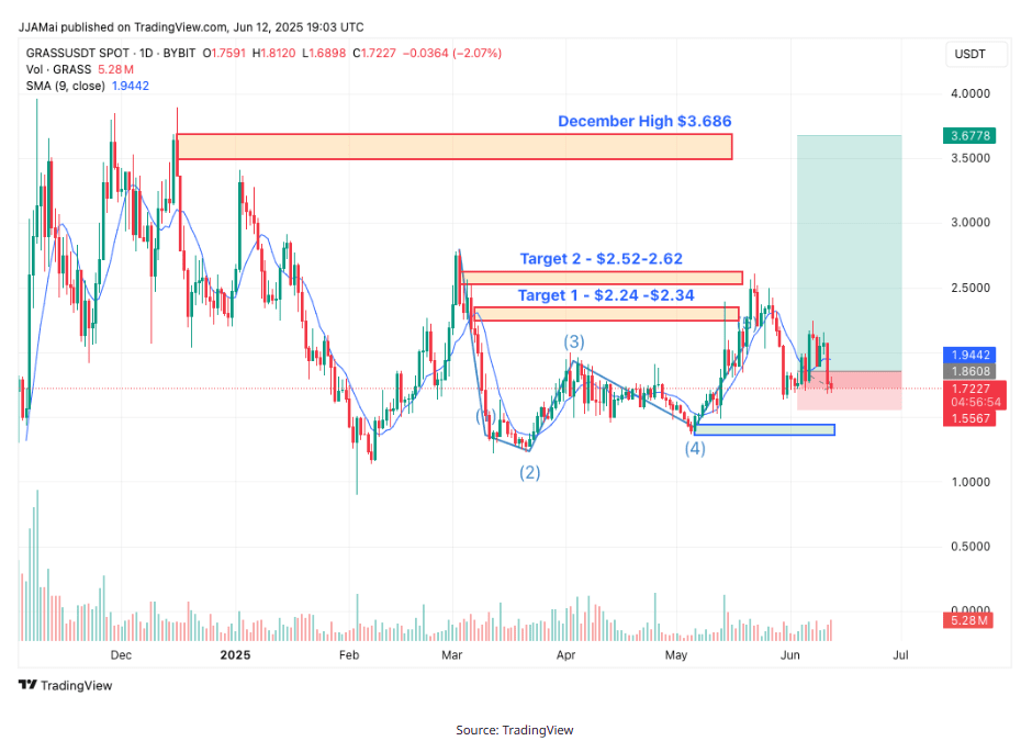 Grafik harian GRASS/USDT menunjukkan aset dalam fase korektif setelah struktur impulsif lima gelombang Elliott, dengan gelombang (4) kemungkinan telah selesai dan harga saat ini mengkonsolidasikan.