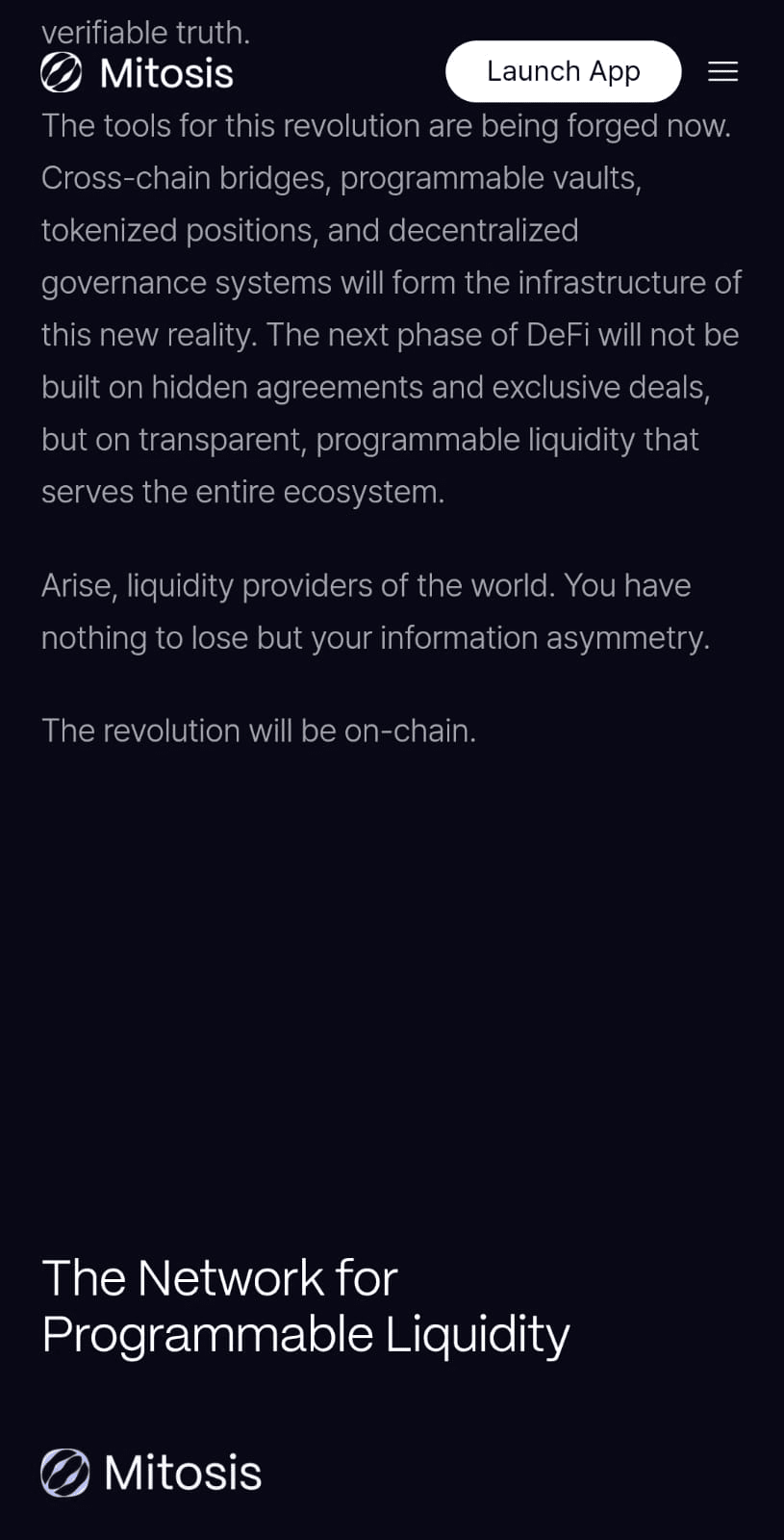 Mitosis dibangun di atas prinsip bahwa kesempatan finansial tidak boleh bergantung pada ukuran dompet. Dengan menghilangkan hambatan teknis dan modal, ia memungkinkan pengguna mana pun — baik yang memegang $50 atau $50,000 — mengakses ekosistem likuiditas yang dapat diprogram yang sama.