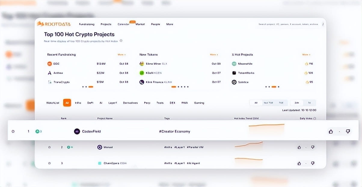 Menurut platform data global yang berwenang, RootData, dalam daftar (Hot Index) yang baru dirilis, CodexField saat ini menduduki peringkat teratas dalam popularitas proyek global. Daftar ini secara luas dianggap sebagai 'penunjuk arah' untuk industri Web3, dengan indeks yang dihitung berdasarkan frekuensi pencarian, jumlah kunjungan halaman, tingkat penyebaran sosial, perilaku pencarian institusi, dan data interaksi di blockchain, yang dapat mencerminkan perubahan struktural dalam perhatian pasar. Platform RootData telah mencatat lebih dari 16.000 proyek, 10.000 lembaga investasi, dan 8.800 putaran pendanaan, dengan rata-rata 4,2 juta permintaan pencarian per bulan, melayani lebih dari 2 juta pengguna Web3. Mencapai puncak dalam sistem sampel yang begitu besar berarti bahwa popularitas ekosistem, pertumbuhan pengguna, dan minat modal CodexField sedang membentuk sinergi.