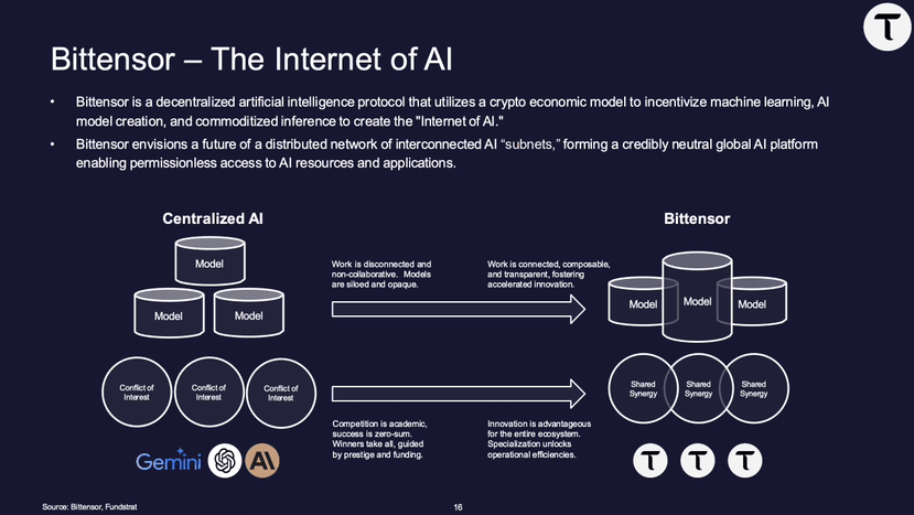 Bittensor (TAO): 'Internet of AI,' Bittensor adalah protokol terdesentralisasi yang mengubah ML menjadi pasar kolaboratif. Penambang dan validator menyumbangkan model, data, dan komputasi melalui 'subnet'—jaringan mini khusus untuk tugas seperti generasi teks atau prediksi. Hadiah datang melalui Proof-of-Intelligence, di mana pekerjaan berkualitas mendapatkan TAO. Tanpa VC, kelangkaan mirip Bitcoin (21M cap, halving), dan nuansa sumber terbuka membuatnya menjadi pemberontak melawan silo AI Big Tech. Dengan 126+ subnet dan triliunan token diproses setiap bulan, didukung oleh Grayscale dan menarik perhatian institusi. TAO menangani staking, pemerintahan, dan mengakses kekuatan otak jaringan.