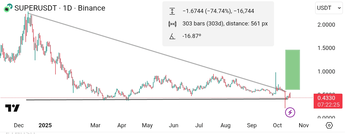 Setelah hampir satu tahun tren turun (-75%) 📉, $SUPER menunjukkan tanda-tanda kehidupan di zona dukungan historis utama ⚡. Harga turun di bawah basis — sebuah sapuan likuiditas klasik — sebelum memantul kembali dengan tajam, menandakan penyerapan pembeli yang kuat 🦬 di level terendah.