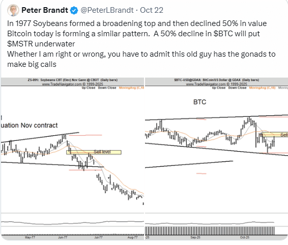 Tetapi Brandt tidak berhenti di situ. Bersamaan dengan skenario bullish-nya, ia juga menyebutkan kemungkinan penurunan — hingga $60,000 — tergantung pada bagaimana sentimen pasar berubah. Ia menggambarkannya sebagai taruhan asimetris: potensi keuntungan yang kuat jika segala sesuatunya berjalan baik, kerugian tajam jika kondisi makro memburuk. Setia pada gayanya, Brandt tidak hanya mengandalkan prediksi; ia memperdagangkan pasar saat bergerak. Ia bahkan menanggapi pos trader lain tentang pola penurunan Bitcoin, mengatakan bahwa ia siap untuk membeli atau menjual tergantung pada apa yang ditunjukkan grafik selanjutnya.