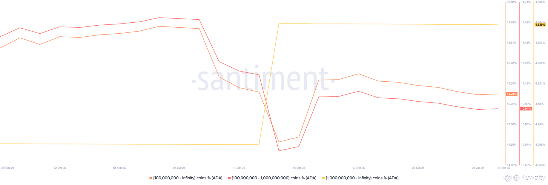 زاد المستثمرون في المحافظ الكبيرة، أو الحيتان، الذين يمتلكون أكثر من 1 مليار ADA من حيازاتهم إلى 4.33% من إجمالي عرض ADA، من 4.10% في وقت سابق من هذا الشهر. عادةً، تعتبر حركة الشراء من المستثمرين الكبار علامة على ارتفاع محتمل في السعر.