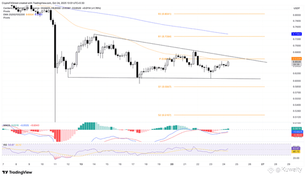 تسجل $ADA ارتدادًا من خط دعم محلي، مما يكمل نمط مثلث هابط على الرسم البياني لسعر 4 ساعات. في وقت كتابة هذا التقرير، تواجه ADA مقاومة عند المتوسط المتحرك الأسي لفترة 50 عند 0.6554 دولار.