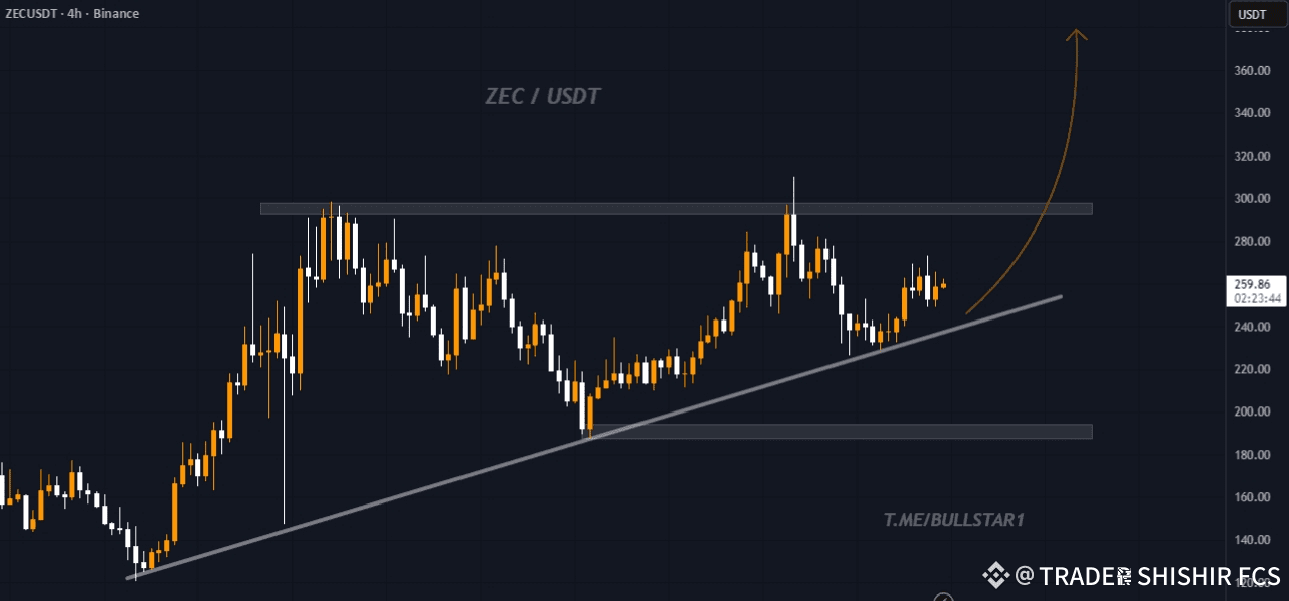 After multiple rejections around the $290–$300 resistance zone, $ZEC is consolidating near $255 and showing signs of accumulation. If the trendline support holds, a potential breakout above $300 could trigger a strong bullish continuation toward $340 and $360.