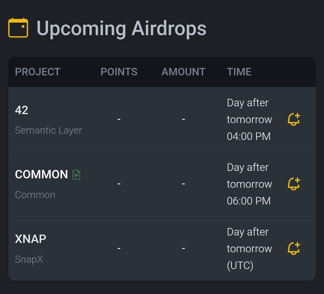 · Airdrop Kunci: 42 (4:00 PM UTC), Semantic Layer, dan XNAP / SnapX (6:00 PM UTC).