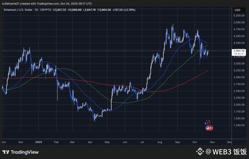 近期 ETH 在 3,964 美元左右徘徊,尝试突破 4,000 美元大关却屡屡受阻📉。短期反弹温和,但整体走势仍显不确定,多头在关键阻力位略显犹豫。50日和100日移动平均线在 4,000-4,200美元附近交汇,这一区间成了 ETH 短期涨势的“天花板”
