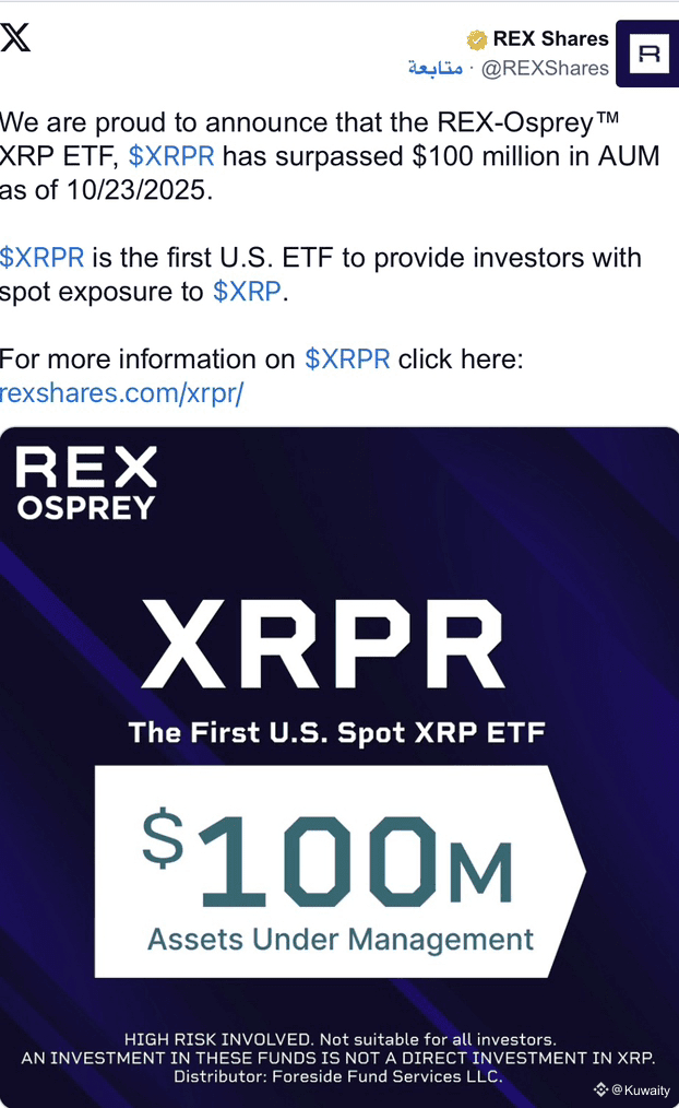 صندوق REX-Osprey's XRPR، أول صندوق ETF لعملة XRP في الولايات المتحدة، تجاوز 100 مليون دولار في الأصول تحت الإدارة في غضون شهر من إطلاقه.