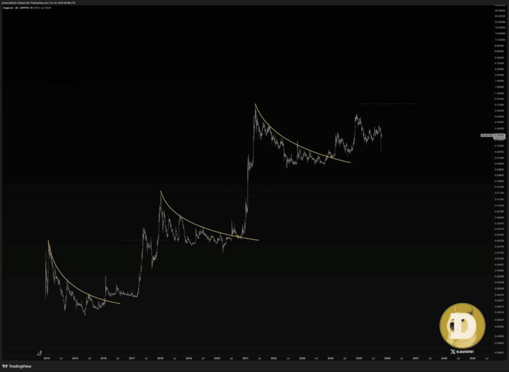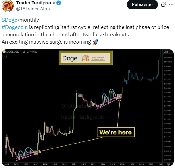 Analis Trader Tardigrade menunjukkan bahwa grafik bulanan DOGE terlihat hampir identik dengan siklus besar pertamanya. Saat itu, Dogecoin bergerak menyamping selama berbulan-bulan sebelum meledak dalam harga — dan dia percaya kita sedang melihat fase akumulasi yang sama lagi. Dua kebangkitan palsu sudah terjadi di dalam saluran perdagangannya, yang menurut Tardigrade bisa menjadi guncangan terakhir sebelum “lonjakan besar.” Ini adalah cerita klasik Dogecoin — periode tenang yang panjang, diikuti oleh rally yang kacau dan tak terhentikan.