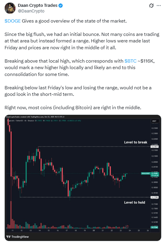 Untuk sekarang, DOGE bertahan di atas dukungan kunci di $0.18. Analis Daan Crypto Trades mencatat bahwa jika tetap di sana dan menembus $0.218, itu bisa menandai awal dari langkah baru ke atas — dengan $0.25 dan $0.33 sebagai target jangka pendek. Namun, penurunan di bawah $0.177 bisa melemahkan pengaturan jangka pendek. Ali Martinez juga menekankan pentingnya mempertahankan level $0.18, menyebutnya sebagai “zona peluncuran.” Dengan paus yang diam-diam mengakumulasi dan pasar yang lebih luas sedang mengkonsolidasikan, langkah berikutnya untuk Dogecoin bisa tiba-tiba — dan eksplosif.