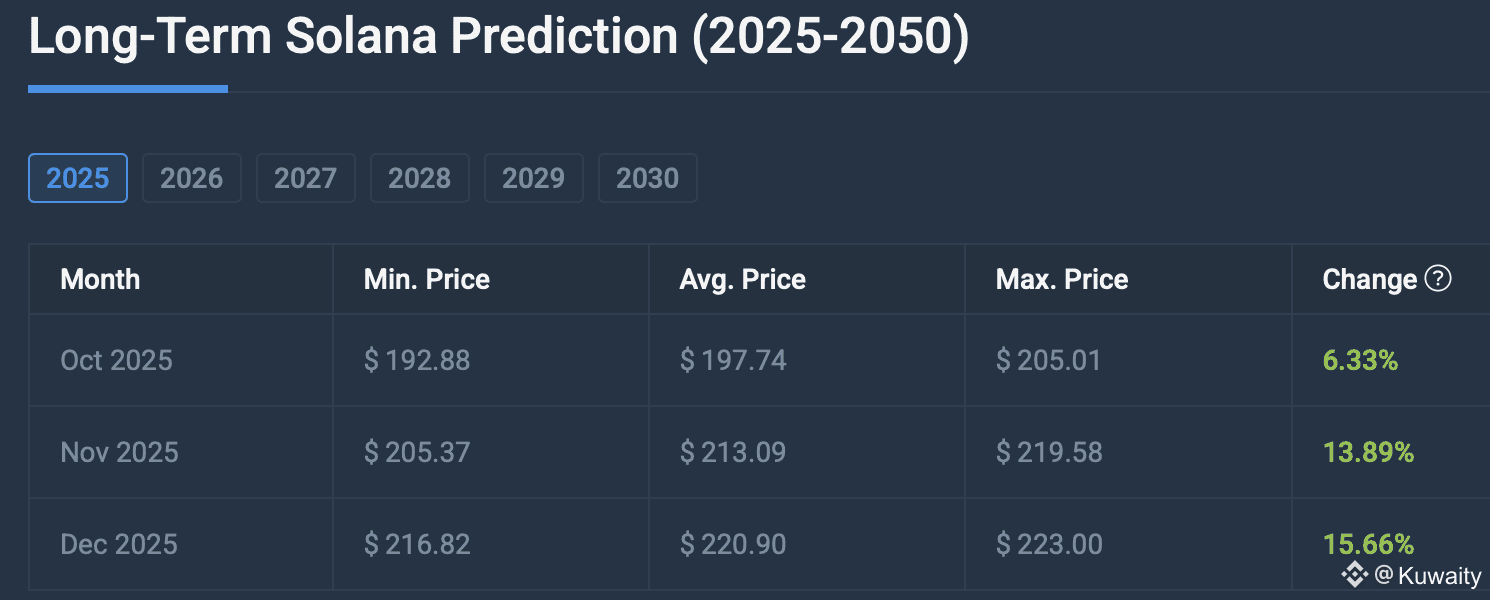 تشير التوقعات طويلة المدى من منصة CoinCodex، أن سولانا قد ترتفع إلى نحو 223 دولار بحلول ديسمبر 2025، بما يمثل زيادة محتملة بنسبة 15.86% عن المستويات الحالية.