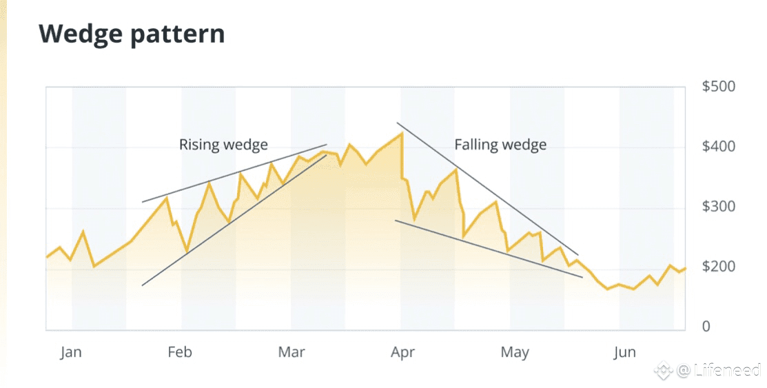 Wedge patterns form when price action creates converging trendlines that slope either upward (rising wedge, typically bearish) or downward (falling wedge, typically bullish).