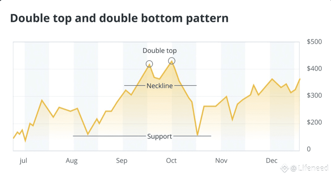 • Example: This pattern often appears in memecoin pump-and-dumps. For instance, Dogecoin (DOGE $0.20) formed a double top in mid-2025 after a social media-driven surge, followed by a sharp correction.