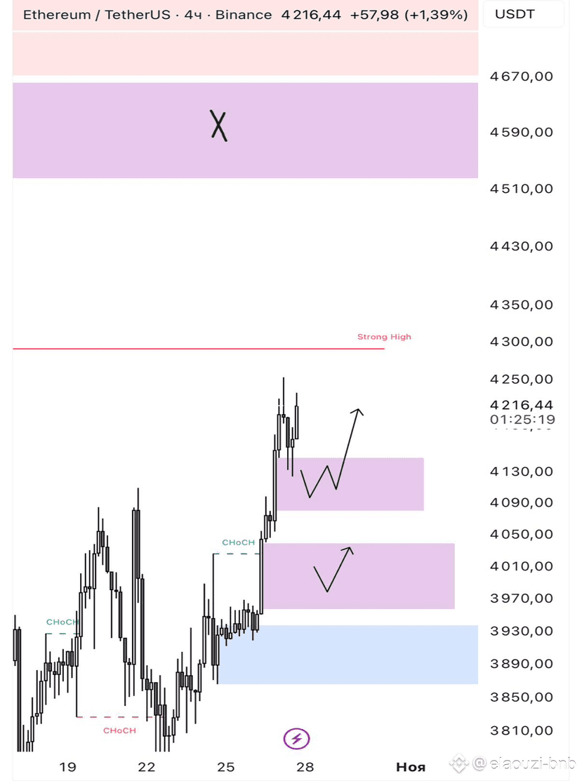 سعر الإيثيريوم ($ETH) في المنطقة المحددة هو إشارة قوية وإيجابية جداً. هذا الثبات يؤكد أن المنطقة تعمل كدعم فعّال، مما يعزز سيناريو الصعود (Long).