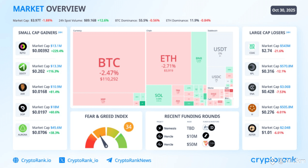 Bitcoin slid to $110,322 (-2.4%), while Ethereum lost 2.7%, failing to hold the $4K zone. The broader market cap dipped below $4T, with BTC dominance softening to 55.5%, signaling modest altcoin rotation despite the risk-off tone.