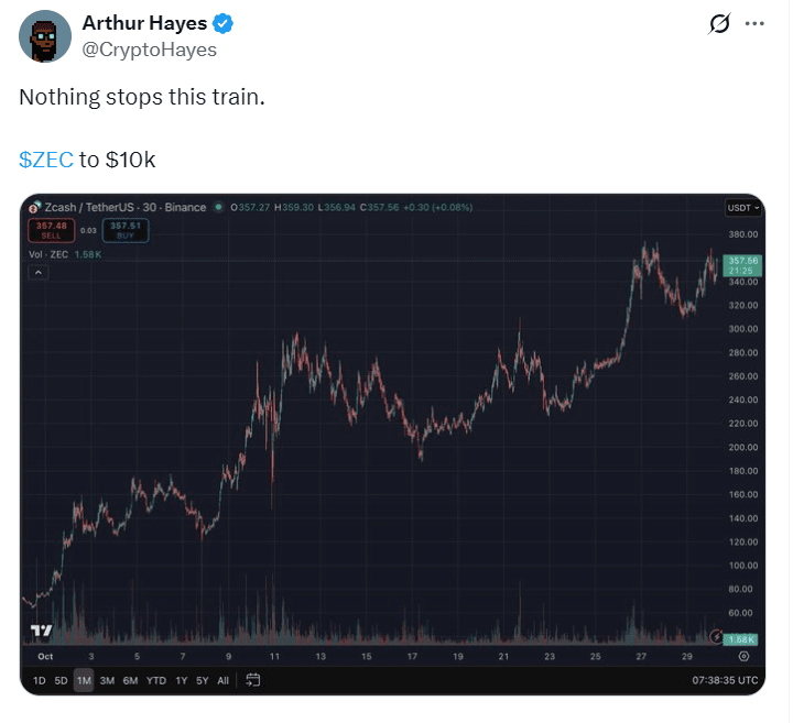 Zcash melonjak 15% menjadi $362 setelah Arthur Hayes mengulangi prediksi harga beraninya $10K.