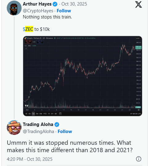 Ini bukan pertama kalinya Hayes memicu sebuah rally. Minggu lalu, komentar serupa darinya mengirim ZEC naik 30% dalam satu hari. Target $10.000-nya mewakili potensi kenaikan besar 2.677% dari level saat ini — yang berarti investasi $100 dapat, dalam teori, berubah menjadi lebih dari $267.000 jika panggilan itu pernah menjadi kenyataan. Apakah itu optimisme atau overhype tergantung pada siapa yang Anda tanyakan, tetapi kegembiraan jelas telah kembali ke ruang koin privasi.