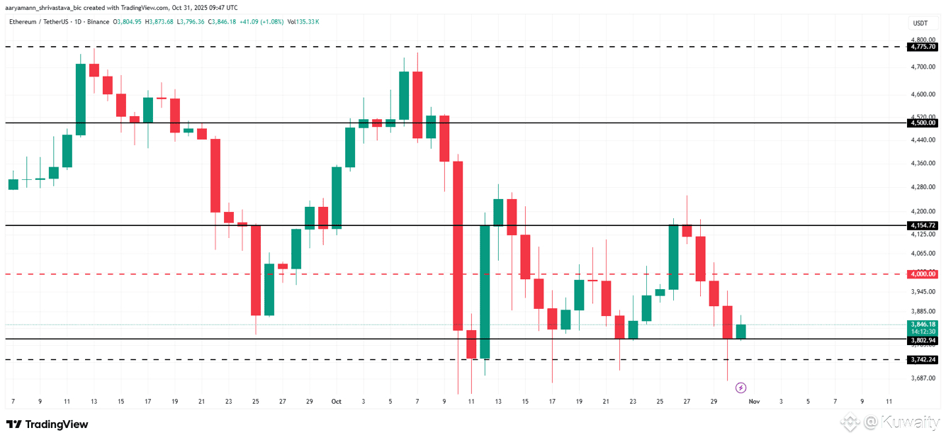 لا تزال ETH محصورة ضمن نطاق بين 3,802$ و4,154$؛ فقدان دعم 3,802$ قد يدفع الأسعار نحو 3,742$ أو 3,500$، ما يؤكد ضعفاً أعمق.