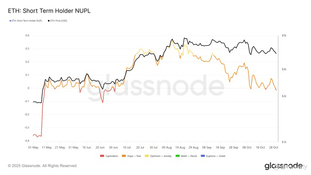 إيثريوم (ETH) يتداول بالقرب من $3,846 مع تعمق المعنويات الهابطة وتراجع مؤشر NUPL إلى منطقة الاستسلام, ما يشير إلى أوضاع بيع مفرط.