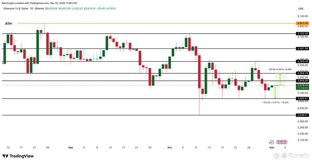 بدأت إيثريوم (ETH) نوفمبر بتفاؤل هادئ، مرتفعةً نحو 1% للتداول قرب $3 875. وبدأت محافظ الحيتان بزيادة حيازاتها مجددًا، ما يشير إلى تجدد الثقة في تعافٍ محتمل.