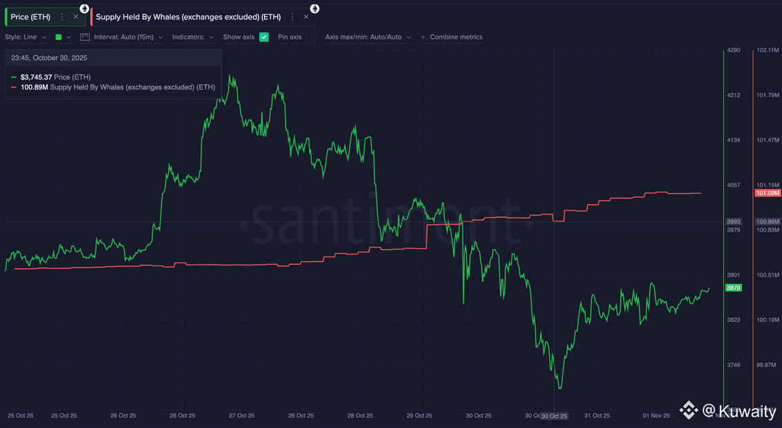تعود حيتان إيثريوم للشراء مجددًا، وهو نمط استؤنف قبل عيد الهالوين مباشرة. وتُظهر بيانات السلسلة أن حيازاتهم المجمعة نمت من 100,89 مليون $ETH إلى 101,09 مليون ETH خلال الساعات الـ48 الماضية.
