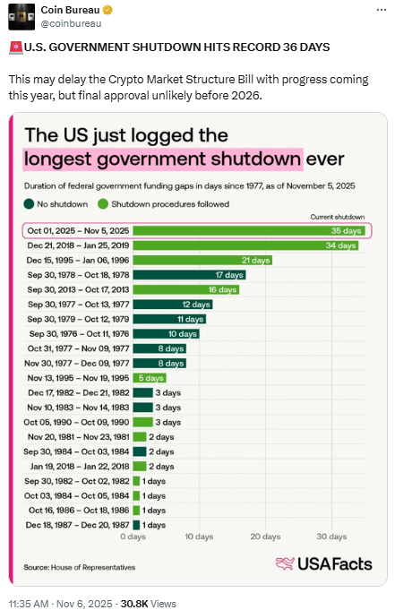 Paralisis pemerintah juga menunda kemajuan pada inisiatif legislatif besar, seperti kerangka regulasi pasar cryptocurrency yang telah lama ditunggu-tunggu. Analis sekarang memperkirakan bahwa karena kebuntuan politik yang sedang berlangsung, RUU tersebut kemungkinan akan ditunda hingga 2026. Ketidakpastian ini terus menggerogoti kepercayaan investor dan menambah tekanan turun pada pasar.