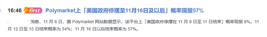 Mendapatkan data kunci: Di Polymarket, probabilitas "penutupan pemerintah AS akan berlangsung hingga setelah 16 November" telah melonjak menjadi 57%! Kongres kemungkinan besar tidak dapat mencapai kesepakatan, pemerintah akan "tutup lebih lama".