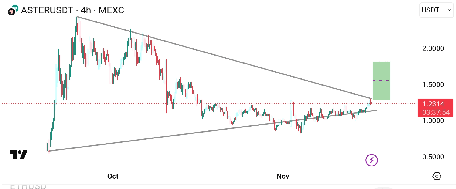 $ASTER perlahan-lahan menuju puncak dari segitiga simetris besar ini 📊, dan lilin sekarang mulai meluncur di atas garis tren resistensi — tanda awal tekanan meningkat untuk breakout besar 👀🔥.
